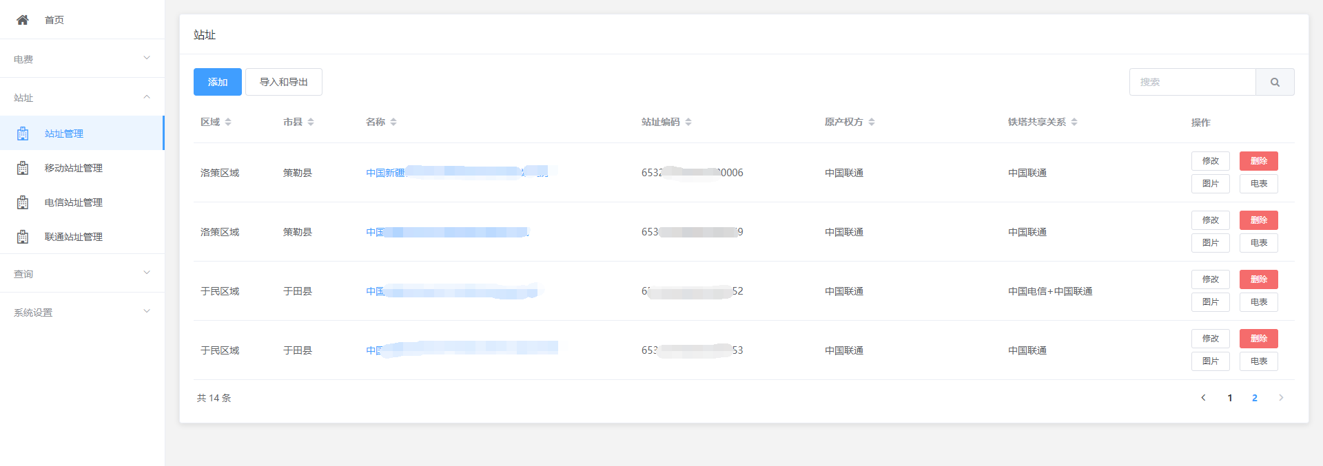站(zhàn)址管理(lǐ):管理(lǐ)站(zhàn)址,包括查詢、添加、修改、删除站(zhàn)址,維護站(zhàn)址 圖片,維護電(diàn)表信息,導入導出站(zhàn)址、導入導出電(diàn)表、導入導出轉供電(diàn)→表等功能(néng)。