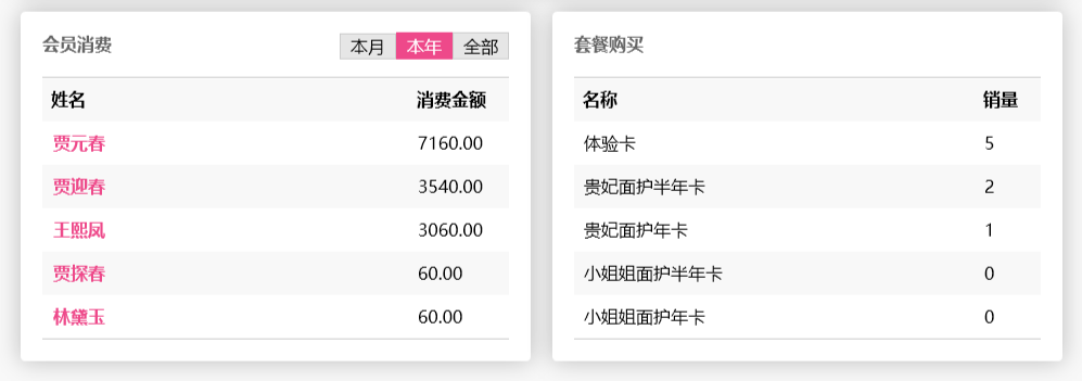 會(huì)員(yuán)在本月(yuè)/本年(nián)/全部消費(fèi)金(jīn)額的(de)統計(jì)對(duì)比;套餐購(gòu)買銷量前五名