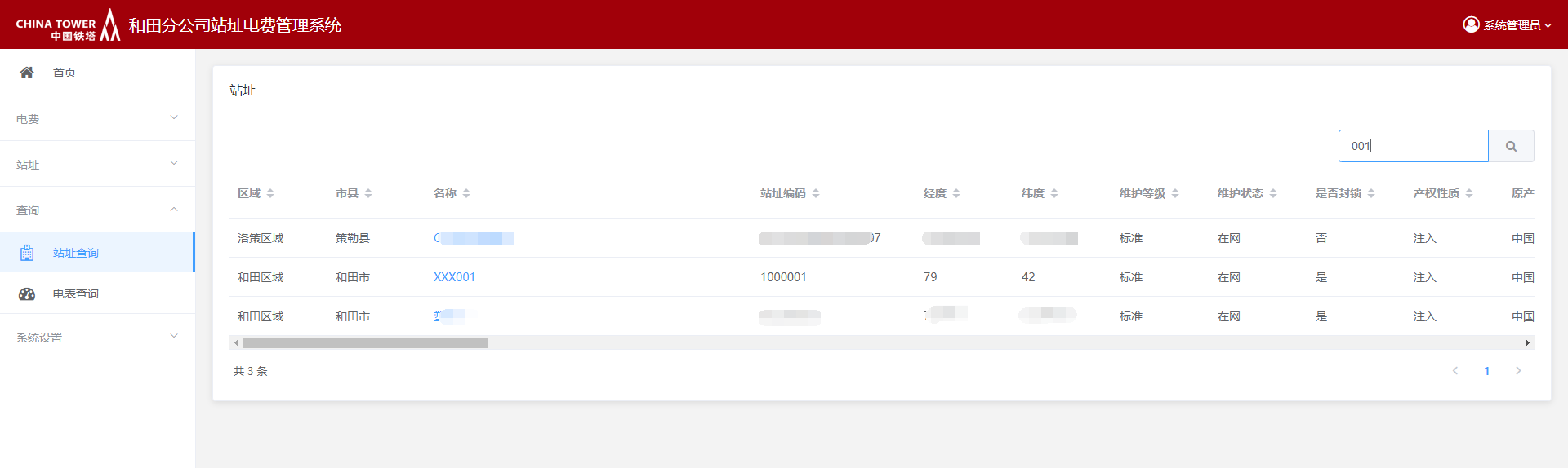 站(zhàn)址管理(lǐ):管理(lǐ)站(zhàn)址,包括查詢、添加、修改、删除站(zhàn)址,維護站(zhàn)址 圖片,維護電(diàn)表信息,導入導出站(zhàn)址、導入導出電(diàn)表、導入導出轉供電(diàn)→表等功能(néng)。